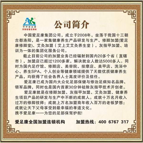 甲甲愛足康修腳堂隸屬于新安縣愛足康修腳有限公司,坐落于我國十三朝古都洛陽,是一家集健康養(yǎng)生項目研發(fā),從事修腳培訓(xùn)、修腳加盟、為一體的集團化公司,十幾年專注于足部保健,頸肩腰腿痛等產(chǎn)品的研發(fā)生產(chǎn)與項目設(shè)計培訓(xùn)。事實證明我們足部保健服務(wù)得到了大眾的信賴和認(rèn)可,截止目前公司的加盟業(yè)務(wù)已經(jīng)輻射到國內(nèi)20多個省(直轄市),“愛足康修腳堂”加盟店已超過1660多家。愛足康已成為國內(nèi)大眾化足部保健與腳病治療的知名品牌。同時也是國內(nèi)頸肩腰腿痛艾灸養(yǎng)生培訓(xùn)大品牌。愛足康就是在修腳加盟、健康養(yǎng)生項目人才培訓(xùn)的路上,不斷的成就人,成就月收入過萬的技術(shù)人才,成就加盟商低風(fēng)險的創(chuàng)業(yè)夢想,成就讓天下父母享受到幸福的孝道文化。